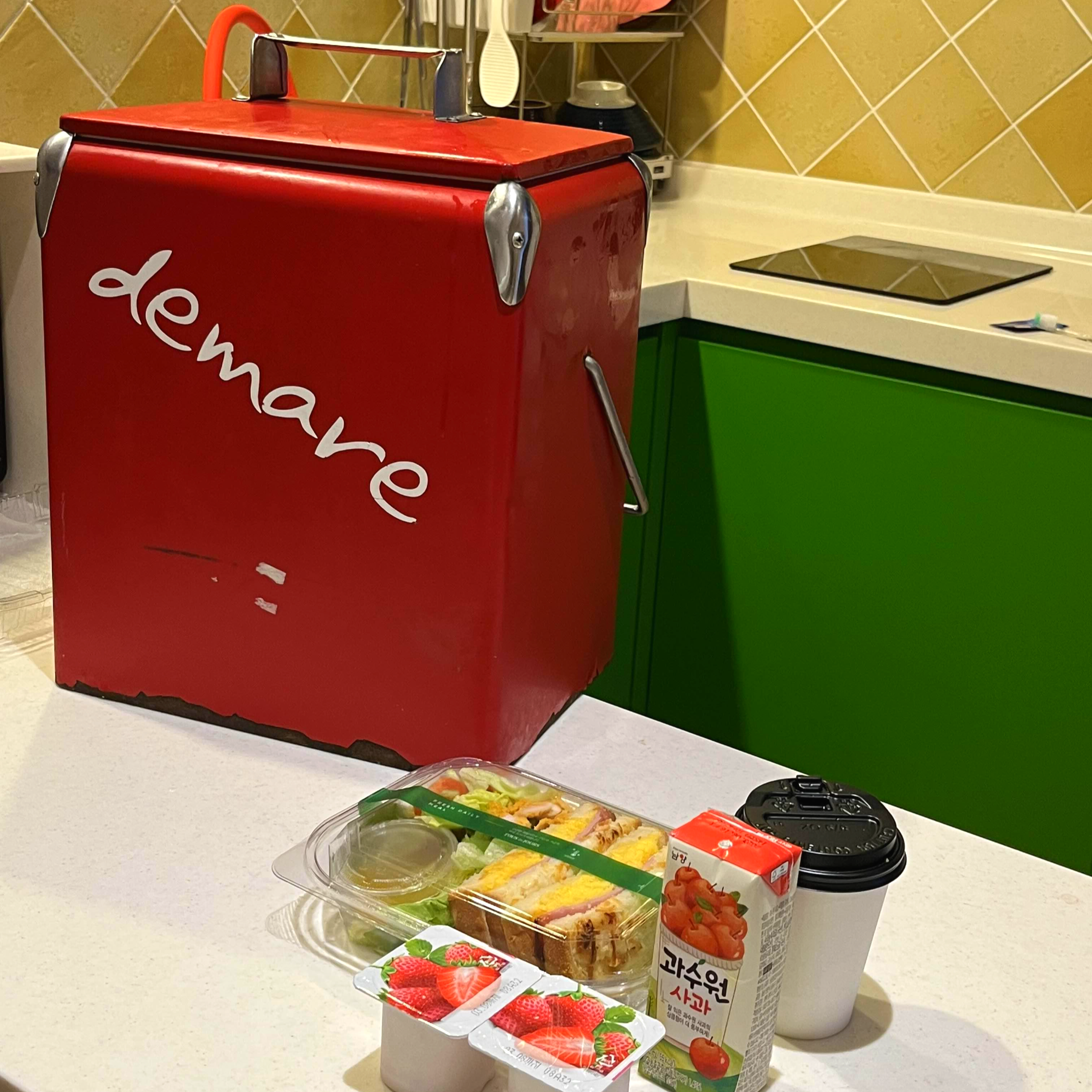 제법 귀여운 통에 샌드위치랑 샐러드, 요거트와 커피가 있었다.
