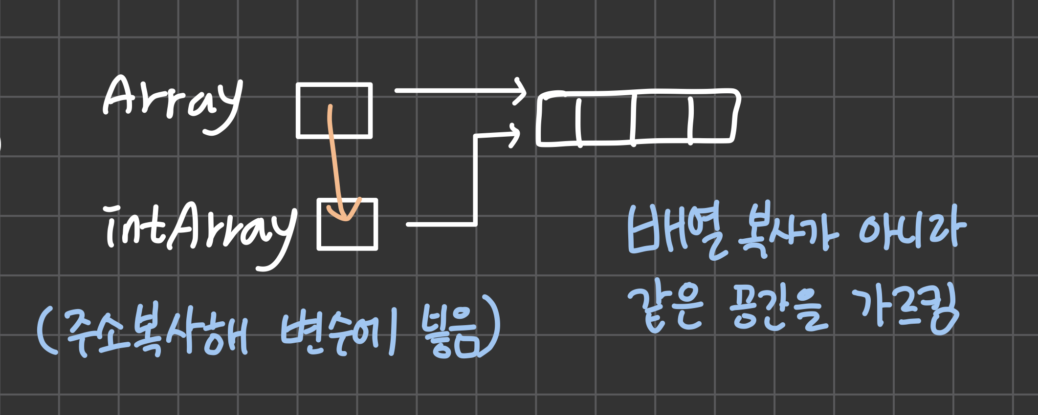 - 같은 곳을 가리키기 때문에 한쪽에서 데이터를 변경하면 다른 한쪽도 변경된 데이터에 접근할 수 있다.